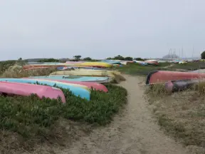A short 500m dirt path on the Cuesta Inlet, with colorful kayaks.