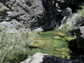 A very short hike in to huge boulders, bright trees, waterfalls, and a clear-water swimming hole. There is a longer hike, if you take the right fork.