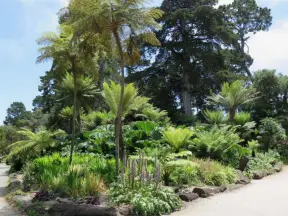 Sunken garden of lush palms from around the world, behind the Hale Ikena dorms.