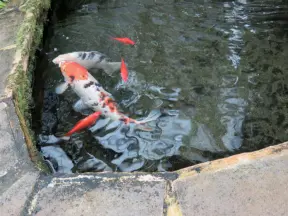 Delightful garden behind a gothic church, with lily pond, koi fish, tropical flowers, sculpted coral walls, fountain, and fresco.