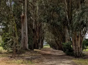 Lovely path beside a eucalyptus forest, on both sides of the creek, with workout stations, in a residential neighborhood. You can walk two miles total. Also called San Luis Ranch.