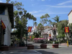A pedestrian-only area on State Street with sidewalk cafes, good shopping, and colorful Spanish architecture.