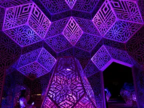 A wonderful exhibit on acres of undulating hills, with a field of lights resembling a flower field, and metal sculptures making patterns of light.
