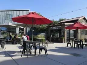 Upscale, colorful plaza in farmhouse style, with modern cafes. Kids climb on a huge log. The fire pit is fantastic at night, surrounded by eucalyptus trees.