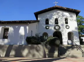 Spanish mission from late 18th century, in downtown San Luis Obispo, with giant roses in the garden behind and a lively plaza in front.