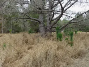 Shady 1.5 mile loop trail that winds gradually up a hill, with good views to the next hill, and awesome spooky oak forest with lichen, Spanish moss (actually lace lichen), and yellow grasses.