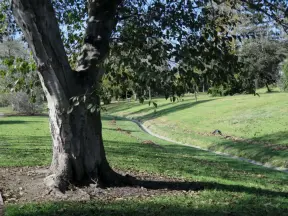 A lush park with rolling hills to run on, one-mile loop walking path, and basketball and sand volleyball courts. Currently has a crime problem.