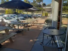 Upscale, colorful plaza in farmhouse style, with modern cafes. Kids climb on a huge log. The fire pit is fantastic at night, surrounded by eucalyptus trees.