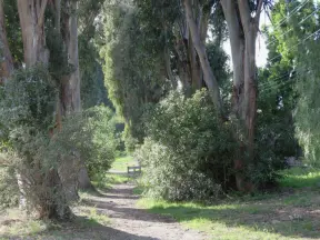 Lovely path beside a eucalyptus forest, on both sides of the creek, with workout stations, in a residential neighborhood. You can walk two miles total. Also called San Luis Ranch.
