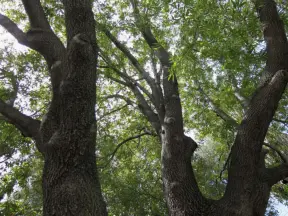 Hilly, sunny campus with tall, impressive trees and green lawns. A hands-on learning university.