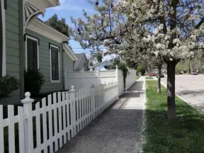 Pretty neighborhood with sweet houses and gardens, and bridge over the creek.