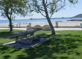 Cement ship playground with logs to climb, seal, dolphin, whale's tail and giant octopus sculptures, picnic tables, and an amazing view of Morro Rock and the inlet.
