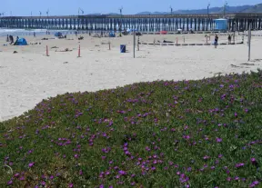 Stairs surrounded by purple and yellow ice plant, leading down to Pismo Beach. Volleyball, long walks, caves, pier and boardwalk.