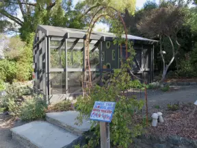 Garden in a sunny, sheltered spot, with cottage with turret under redwood trees, Buddhist gazebo, goats, and flowers galore! Seasonal pumpkins and Christmas market!