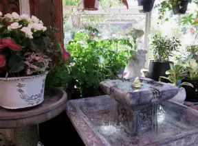 A tropical wonderland of palms, ferns, bromeliads, fountains, sculptures, rocks, ironwork gates, and pergolas, with the delightful scent of flowers filling the air.