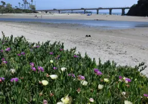 Stairs surrounded by purple and yellow ice plant, leading down to Pismo Beach. Volleyball, long walks, caves, pier and boardwalk.