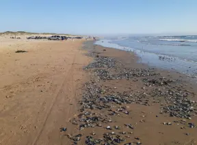 A glorious beach in Grover Beach town, with sand dunes and a wooden boardwalk, plus an octagon-shaped wooden pier in the sand.