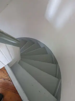 Gorgeous view from the top of a lovely red lighthouse with a rare Fresnel lens on top of a little hill.