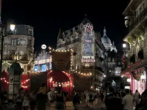 The Eiffel Tower, the Arc de Triomphe, and indoor cobblestone streets that look like Parisian streets, with Art-Nouveau Metro signs.