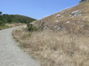 A steep 0.8 km walk through dry grasses over a hill and to the other side, with views of the lake on both sides.