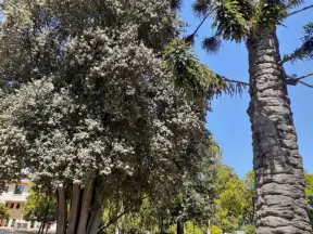 Lovely path beside a eucalyptus forest, on both sides of the creek, with workout stations, in a residential neighborhood. You can walk two miles total. Also called San Luis Ranch.