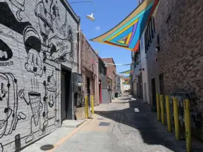 A trendy street in the middle of a sketchy neighborhood, with cafes and colorful graffiti-covered walls.