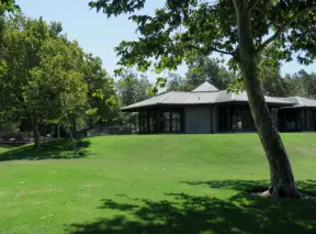 A peaceful 3-mile walk through oaky forest, past lush landscaping and a park with a historic adobe house, and among a neighborhood with gardens filled with flowers.