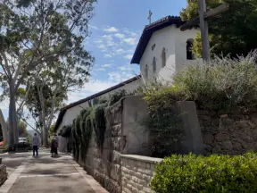 Spanish mission from late 18th century, in downtown San Luis Obispo, with giant roses in the garden behind and a lively plaza in front.