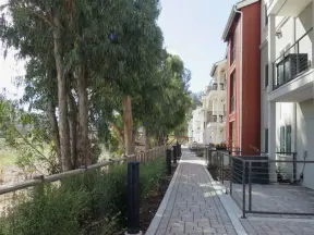 Lovely path beside a eucalyptus forest, on both sides of the creek, with workout stations, in a residential neighborhood. You can walk two miles total. Also called San Luis Ranch.