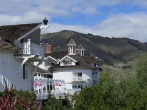 Narrow tree-lined streets in the Anholm District with historic houses and views of Madonna Mountain and Bishop Peak, and a sweet deli.