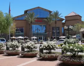 Outdoor mall with movie theater, cafes with atmosphere, candy shop, and more.