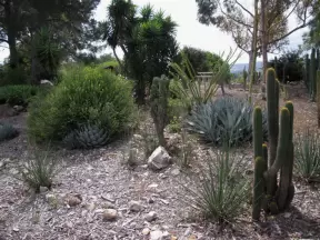 Botanical garden on top of a hill with views all around, cactus garden, colorful wildflowers, and imaginative kid's garden.
