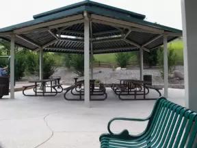 Large field with sweeping views, playgrounds, workout stations, picnic pavilions, and walking path around the field.