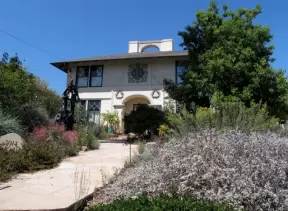 Spanish mission from late 18th century, in downtown San Luis Obispo, with giant roses in the garden behind and a lively plaza in front.