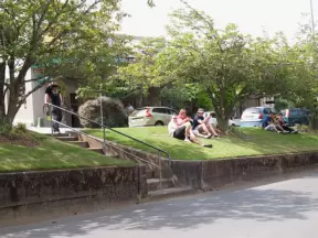 Gorgeous main street with large, European-style park where people sit on the grass by the fountain.