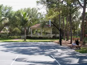 Tropical park with sky-high playground for older kids, toddler playground, fitness trail and stations, pale-lime gazebo, and spiffy basketball courts.