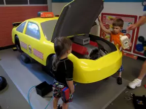 Attractive children's museum with market and carts, Newton's playhouse where you can shoot balls, ball pit, fire engine, oak tree tunnels, stage, dress-up area, and pizza kitchen.