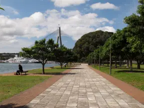 Birds sing a thousand melodies in the huge Moreton Bay fig trees while happy people stroll along the walkway at this waterfront park.