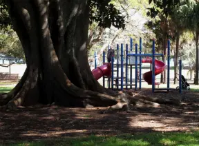 Magical spot with white sand beach on the river, coconut trees galore, views of the Ernest Lyons Bridge, and shady playground with tall, tall slides!