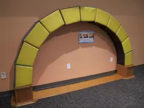 Attractive children's museum with market and carts, Newton's playhouse where you can shoot balls, ball pit, fire engine, oak tree tunnels, stage, dress-up area, and pizza kitchen.