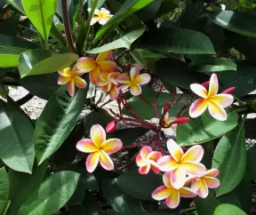 Paradise of plumeria trees and bright bougainvillea in summer.