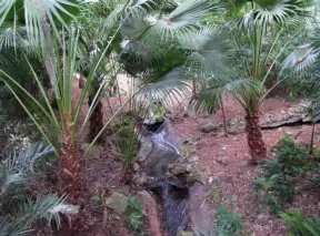 Lush paradise with water lilies galore, rustling bamboo, stone bridge, tropical flowers, strangler fig, and a gorgeous royal palm grove.