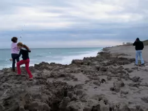 Beach where fishermen hang out on the jetty and surfers come to ride the waves at Jupiter Inlet.