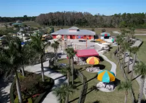 Tropical park with sky-high playground for older kids, toddler playground, fitness trail and stations, pale-lime gazebo, and spiffy basketball courts.