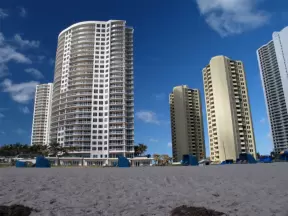 Thin strip of beach with shadeless boardwalk, white swirly wave wall, nice sand, unattractive people, and had-better-days condos.