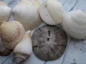 Wide-open beach with pale grey sand, shells on the shore, and aquamarine water, across from a playground, turtle center, and hike.