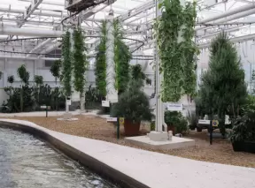 Hotel inside a giant atrium with tropical plants, fish, alligators, and decorations. ICE sculpture event in December.