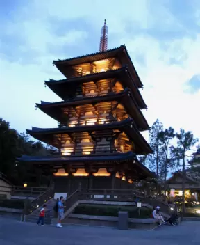 Pleasant garden with waterfall, huge lizards, boulders, pavilions with lovely circle windows and distinctive roofs, and pond, but some city noise.