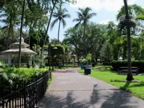 Waterfront park with walking paths under a zillion coconut trees, ship playground in white sand, hopscotch, and colorful pictures and hopscotch on the path.