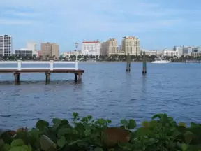 Pretty park along the intracoastal waterway near high rises, with walking paths, playground, gazebos, fountain, and tennis courts.
